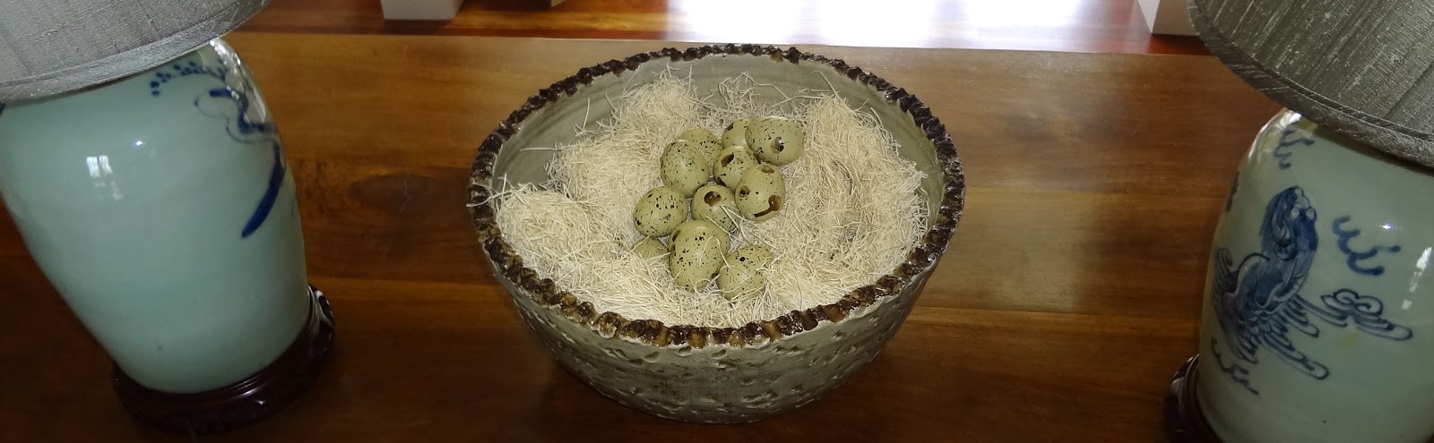 Inside my snowflake candle holders and snowmen are tucked into their bubble-wrap blankets. Now monochromatic eggs nest in a pottery bowl.